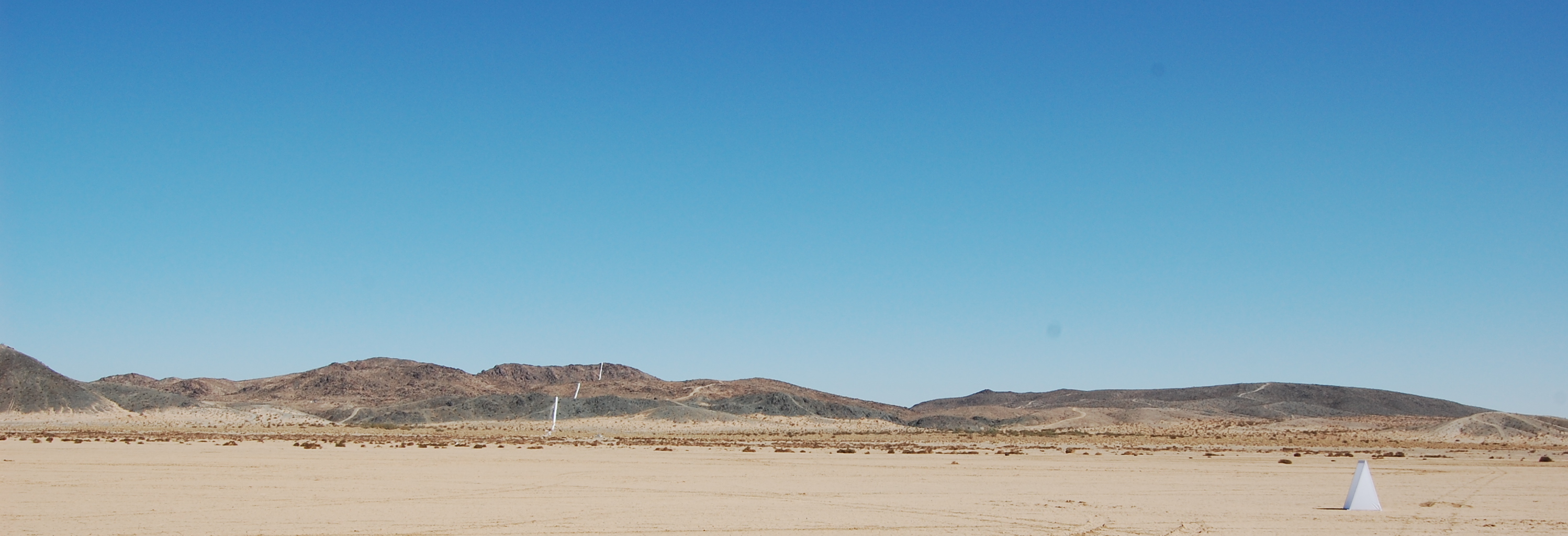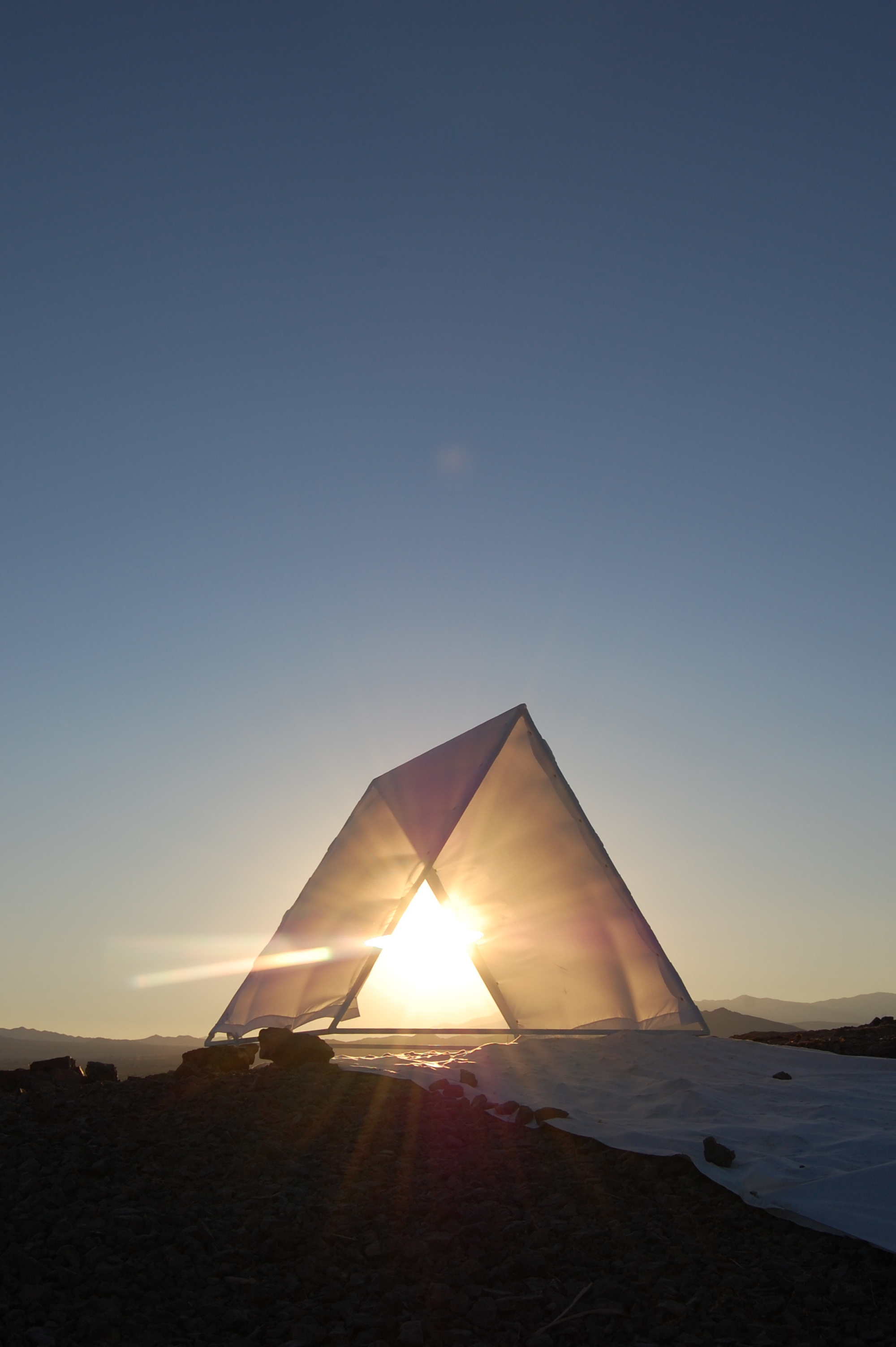Here-There, There-Here was an installation designed in collaboration with ROLU for High Desert Test Sites, an annual exhibition curated by Andrea Zittel. Here-There, There-Here was a five-food-wide, two mile-long roll of white felt stretchng across a dry lake bed. Along the lines are a series of different sized triangles that play on human perspective.