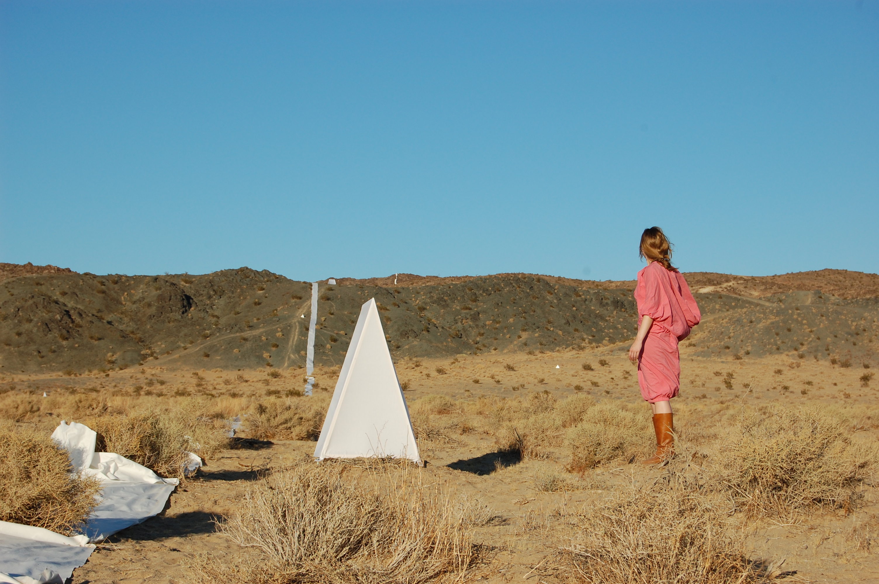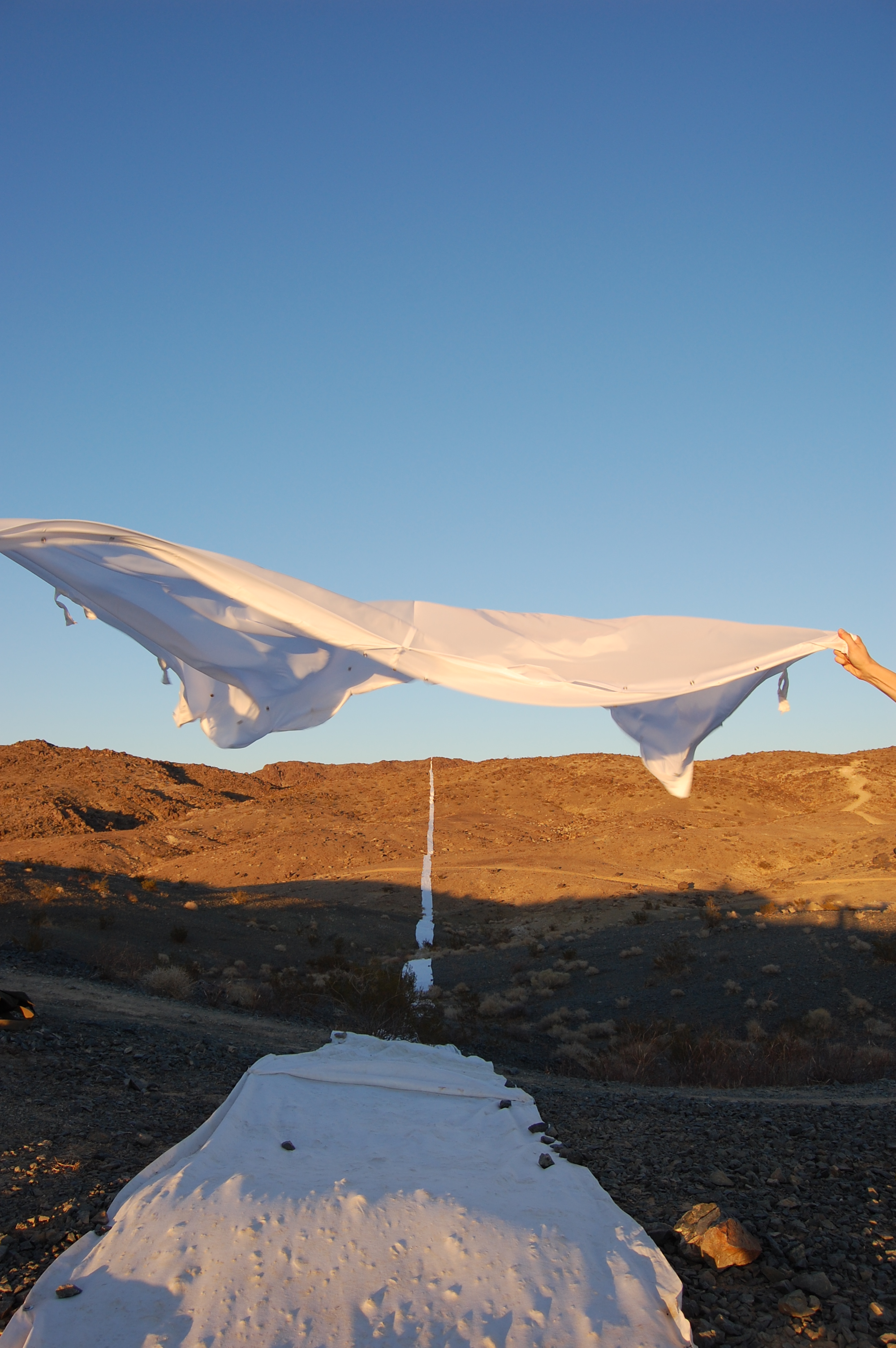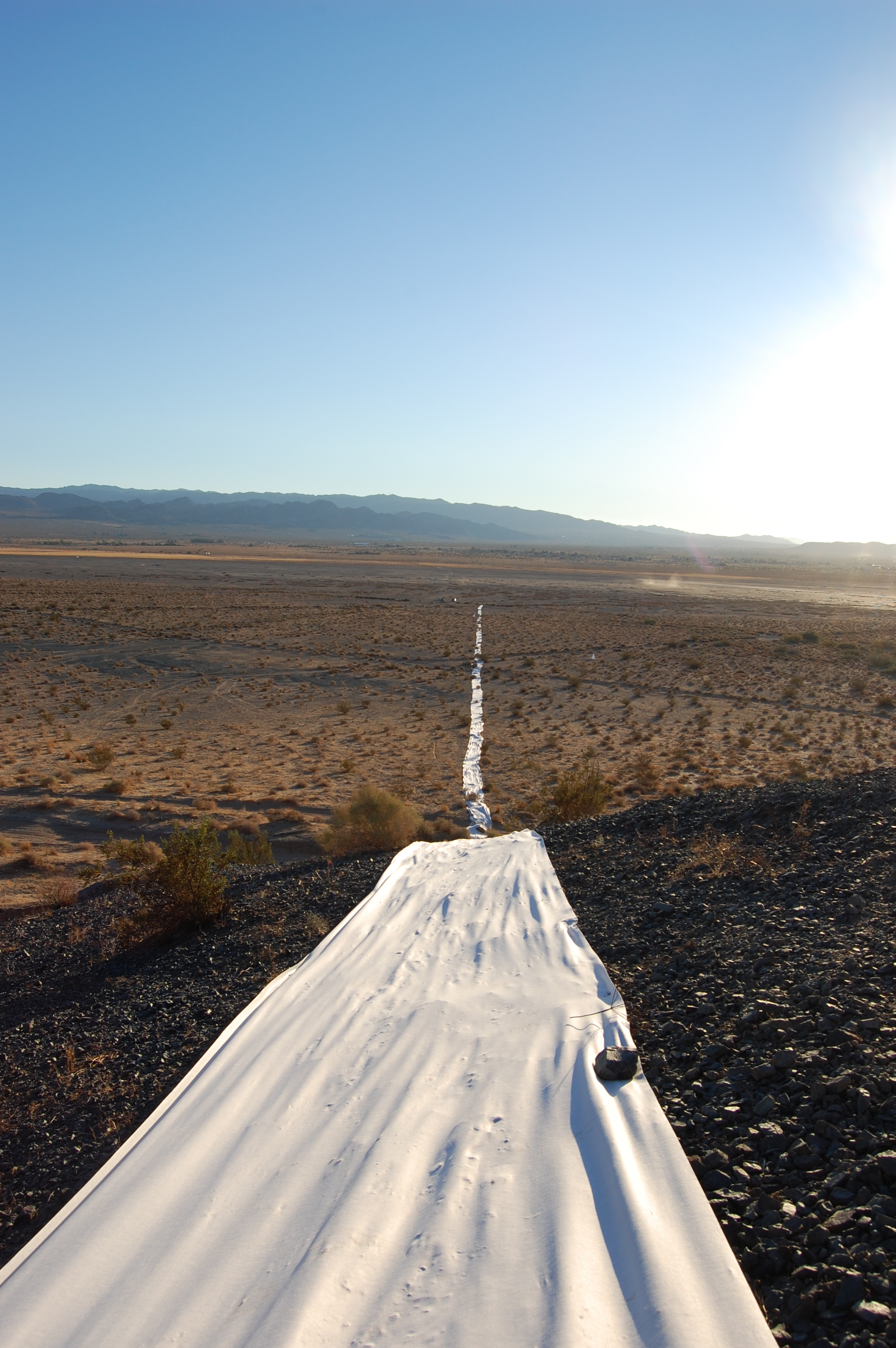 Here—There, There—Here was a five-foot-wide, two-mile-long roll of white felt, unrolled in a dry lake bed. Its surface was interrupted by a series of triangular volumes of various size and dimension that shift the scale from the monumental to the human. The volumes invited actions—to sit against, to measure with, to get inside of, to touch—while the line was traversed.